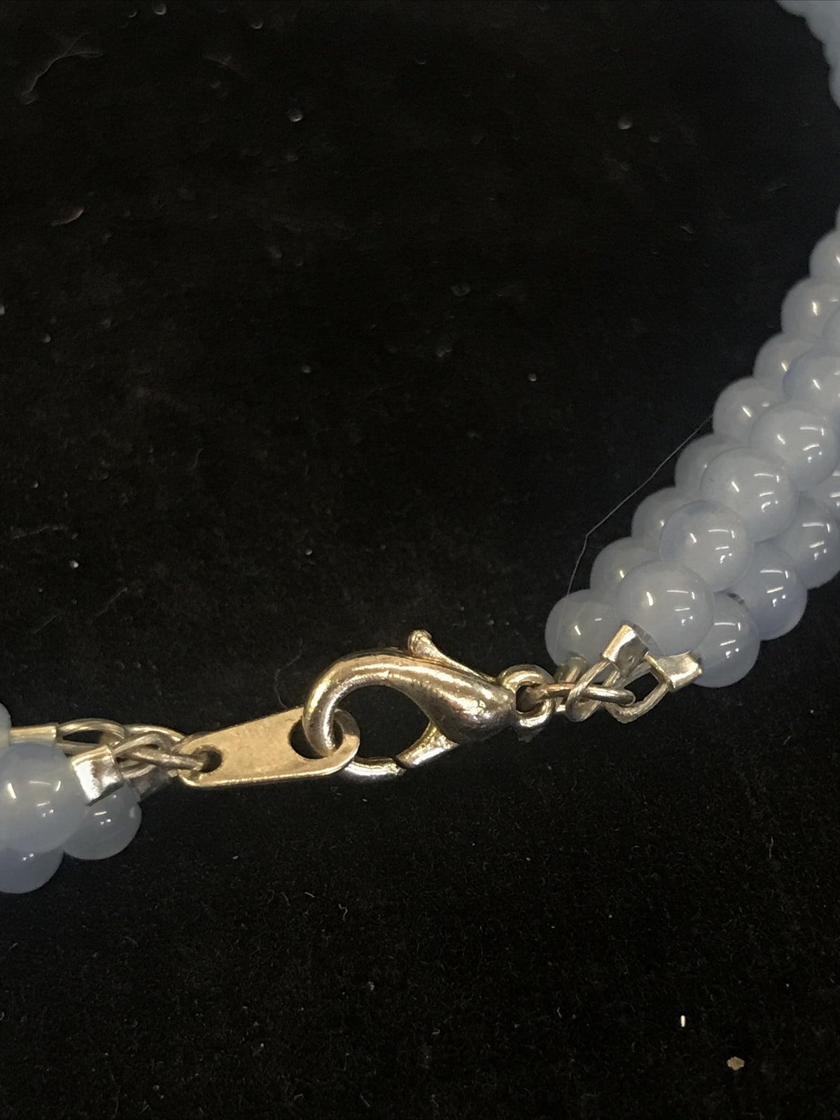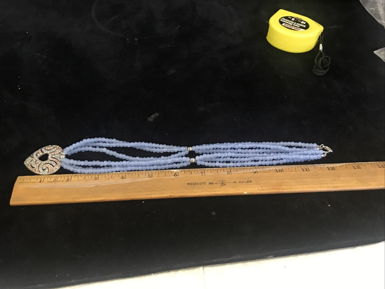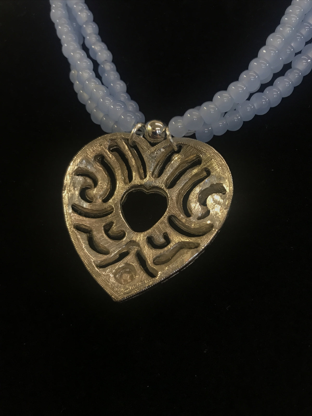 Vintage Blue Glass Bead Necklace with heart blue & pink rhinestone pendant