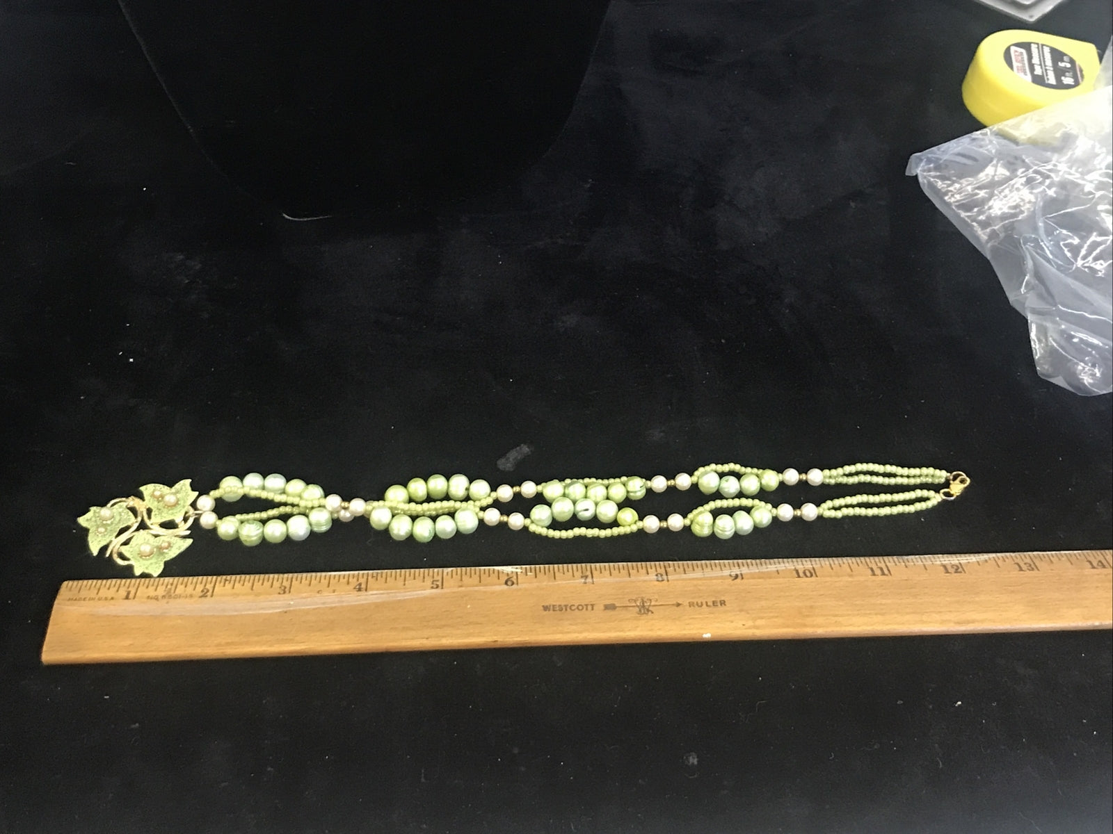 Offered for sale is a vintage lime green freshwater pearl necklace, 2 stands with an enamel pendant of 3 leaves. The necklace is 22" long with a 12.5" total drop. The pendant is 1 3/4" long. Excellent condition-beautiful!