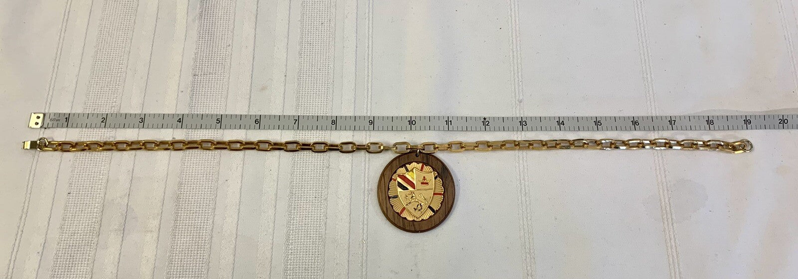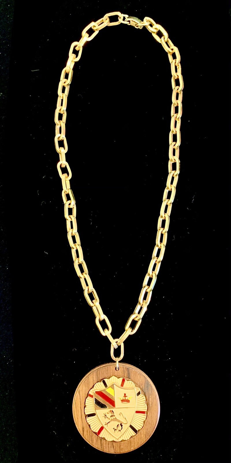 Offered for sale is a rare vintage Kramer 19" goldtone link necklace with a 2" diameter round lion coat of arms pendant and a matching pair of clip earrings with lions. See pics for details. Excellent condition-stored in s jewelry box for last 40 years.