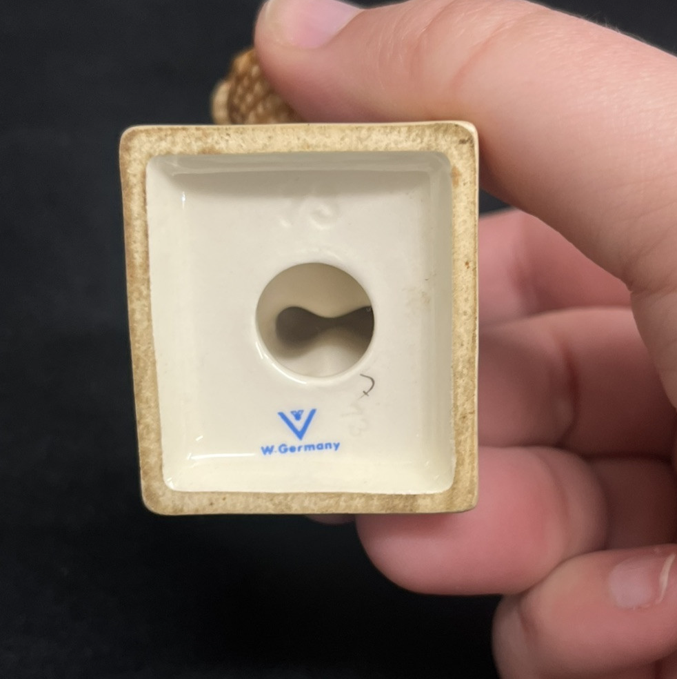This is a Vintage M.I. Hummel porcelain figurine featuring the design "Little Helper." Made in Germany in the 1960s, this colorful figurine stands at 4.25 inches in height and depicts a girl. The item is part of the Hummel collection and is made of porcelain, with dimensions of 2.5 inches in length and 1.5 inches in width.