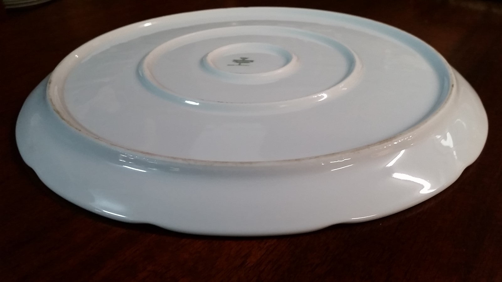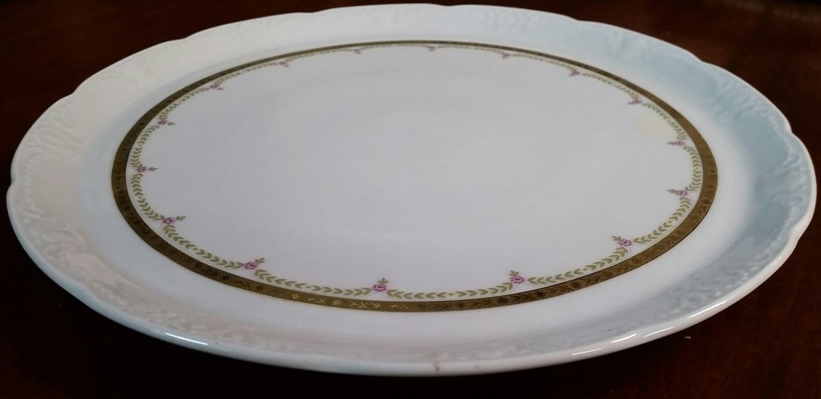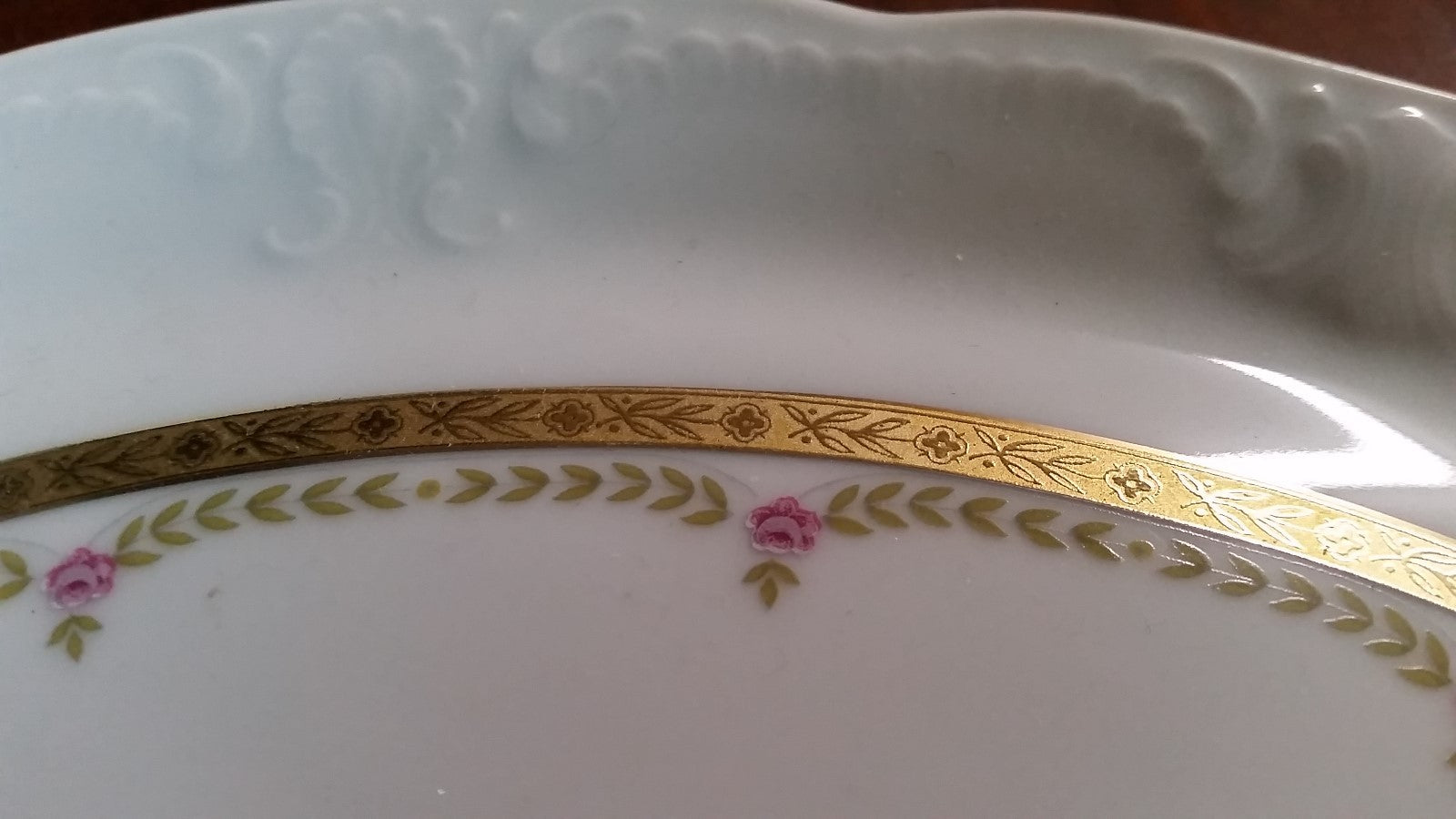 Offered for sale is an antique charger or 12 1/4" round plate made by the Mitterteich China Company. Replacements lists the pattern as MIT 163. The rim is embossed with cartouches and garland. A Gold floral band is inside the rim . A hand painted rose garland surrounds the inside of the gold band. This charger was made in Germany as marked on the back. It is in perfect condition with no chips, cracks, etc.