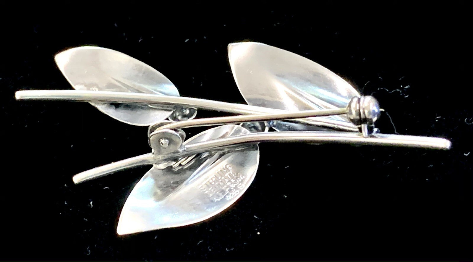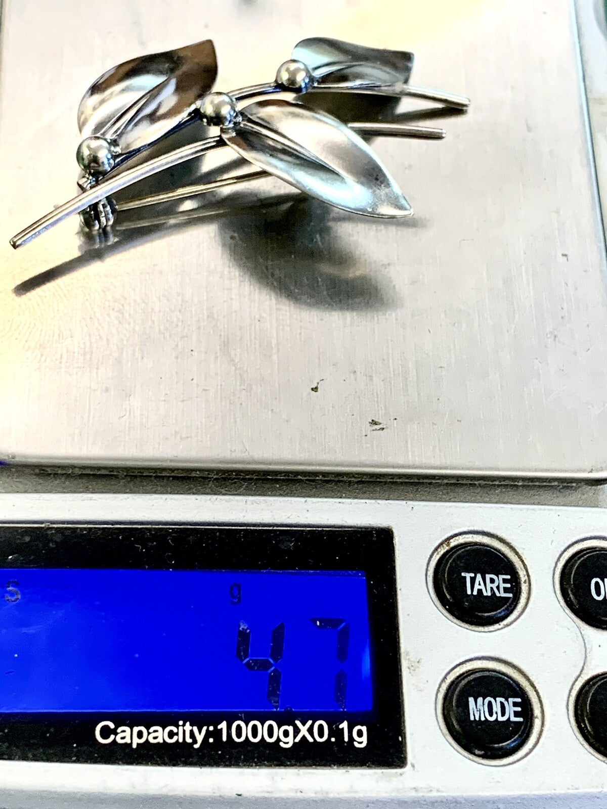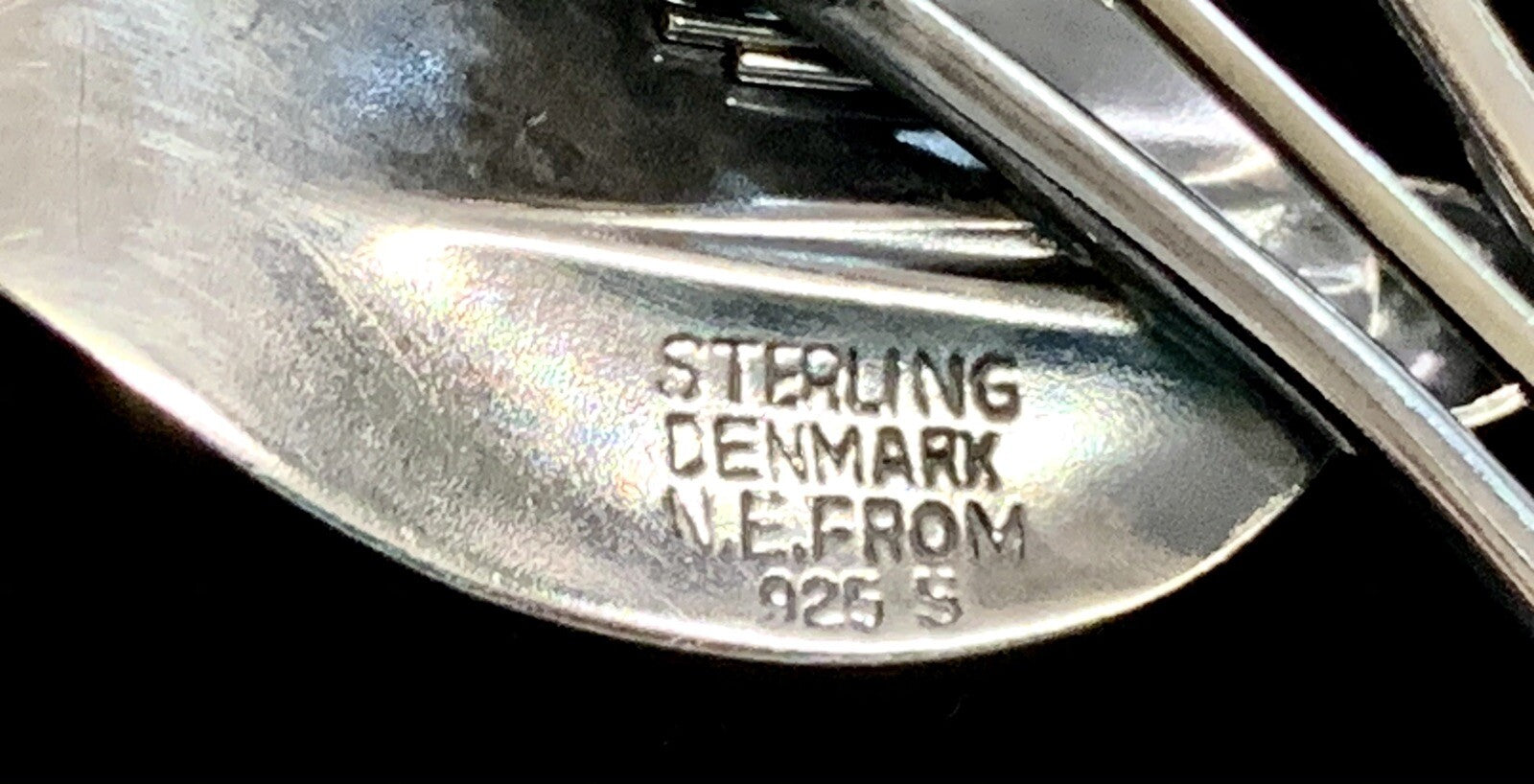 Niels Erik From opened his first workshop in 1931. For the next 40 years, his floral-inspired pieces from Denmark's Arts and Crafts period were the company's signature styles. The pin measures 2 1/4 inches by 1.25 inch and weighs 4.7 grams. The piece is hallmarked STERLING, DENMARK, N.E. FROM, 925S.