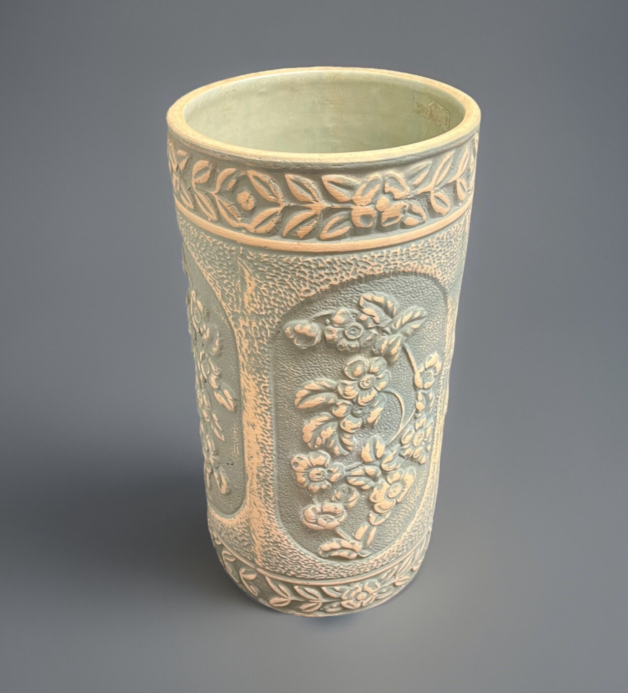 Vintage Robinson Ransbottom Pottery Dogwood Umbrella Stand Holder 18" features a green clay umbrella stand with a diameter of 9". This art pottery piece showcases a pattern of dogwood flowers, crafted using pottery techniques.