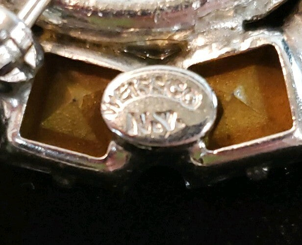 Offered for sale is a signed Weiss rhinestone pin brooch with smoky gray and clear stones. The prong set clear rhinestones accent the gray stones. It measures 2.5" x 2". Pin works well and it is an excellent example of Weiss craftmanship and artistry,
