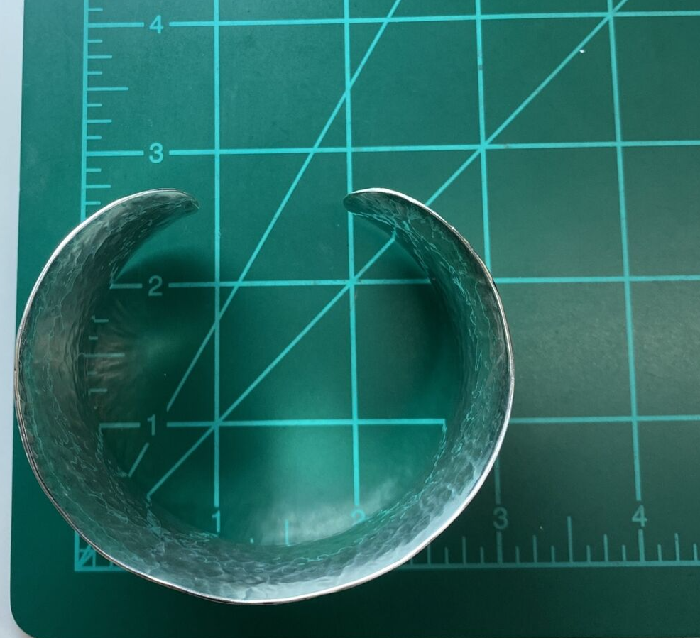 Offered for sale is a sterling silver hammered cuff bracelet measuring 1 7/8 at widest point", 2 3/4" across, and 6" around inside with a 1" opening that can be adjusted slightly.