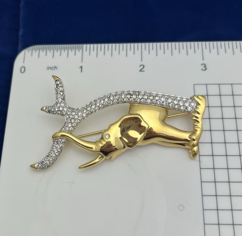 Add some sparkle to your jewelry collection with this vintage 1993 Swarovski brooch. This beautiful brooch features a stunning elephant and tree design, embellished with white and colorless crystals. The brooch is plated with yellow gold, adding a touch of luxury to any outfit.