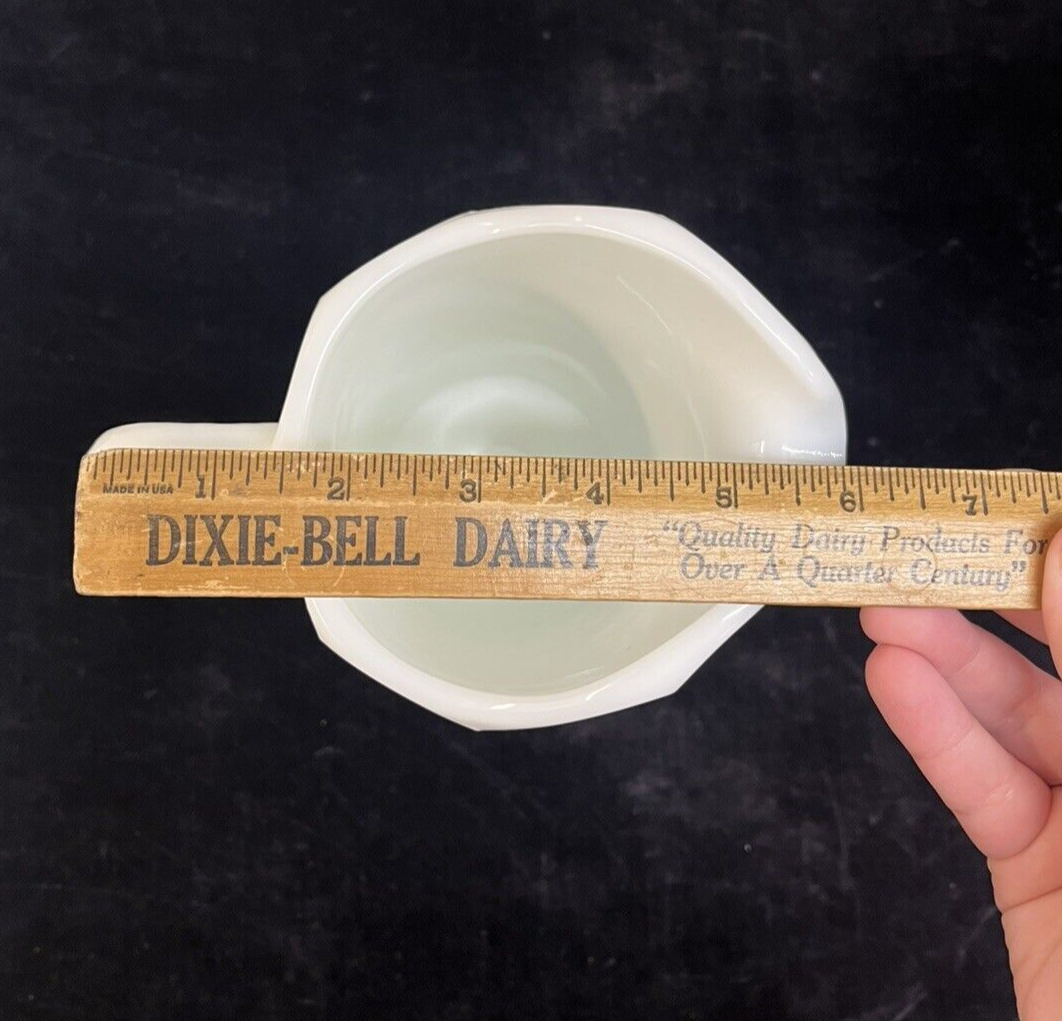 This vintage Westmoreland milk glass pitcher features a Paneled Grape pattern, standing at 9 inches tall with a capacity of one quart. The pitcher showcases a white color, measuring 6.75 inches in length and 4.25 inches in width, with a 4-inch diameter base. Made of glass in a production style known as Milk Glass, the design includes grape and ivy motifs, forming part of the Paneled Grape product line.