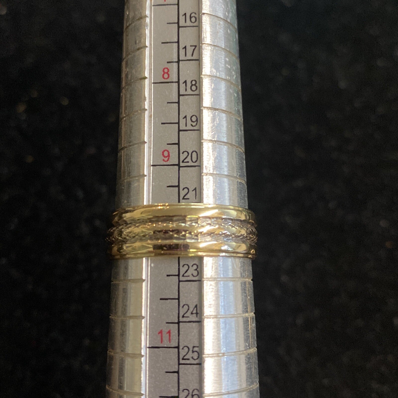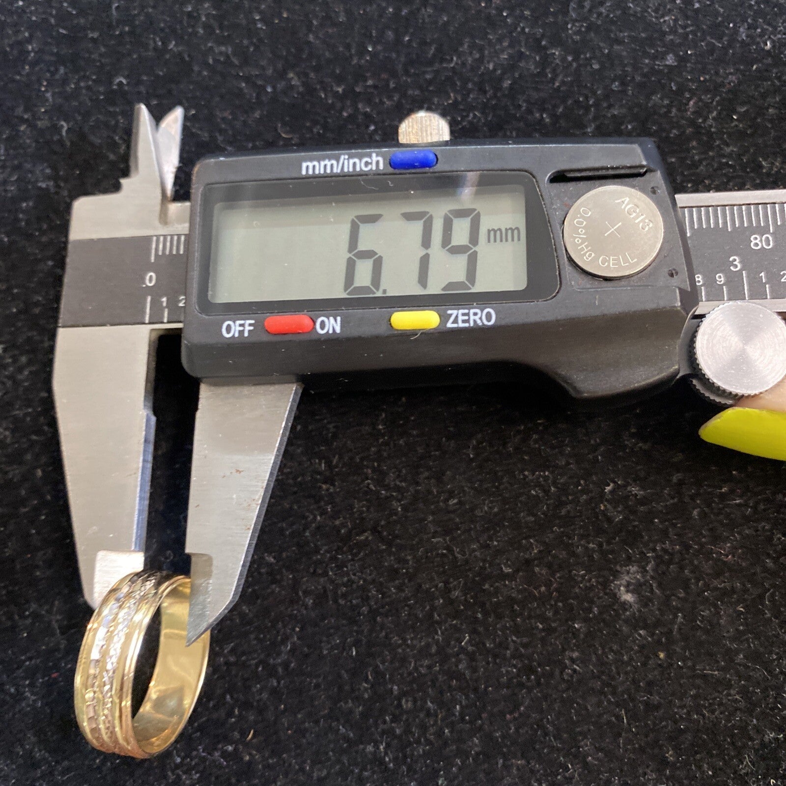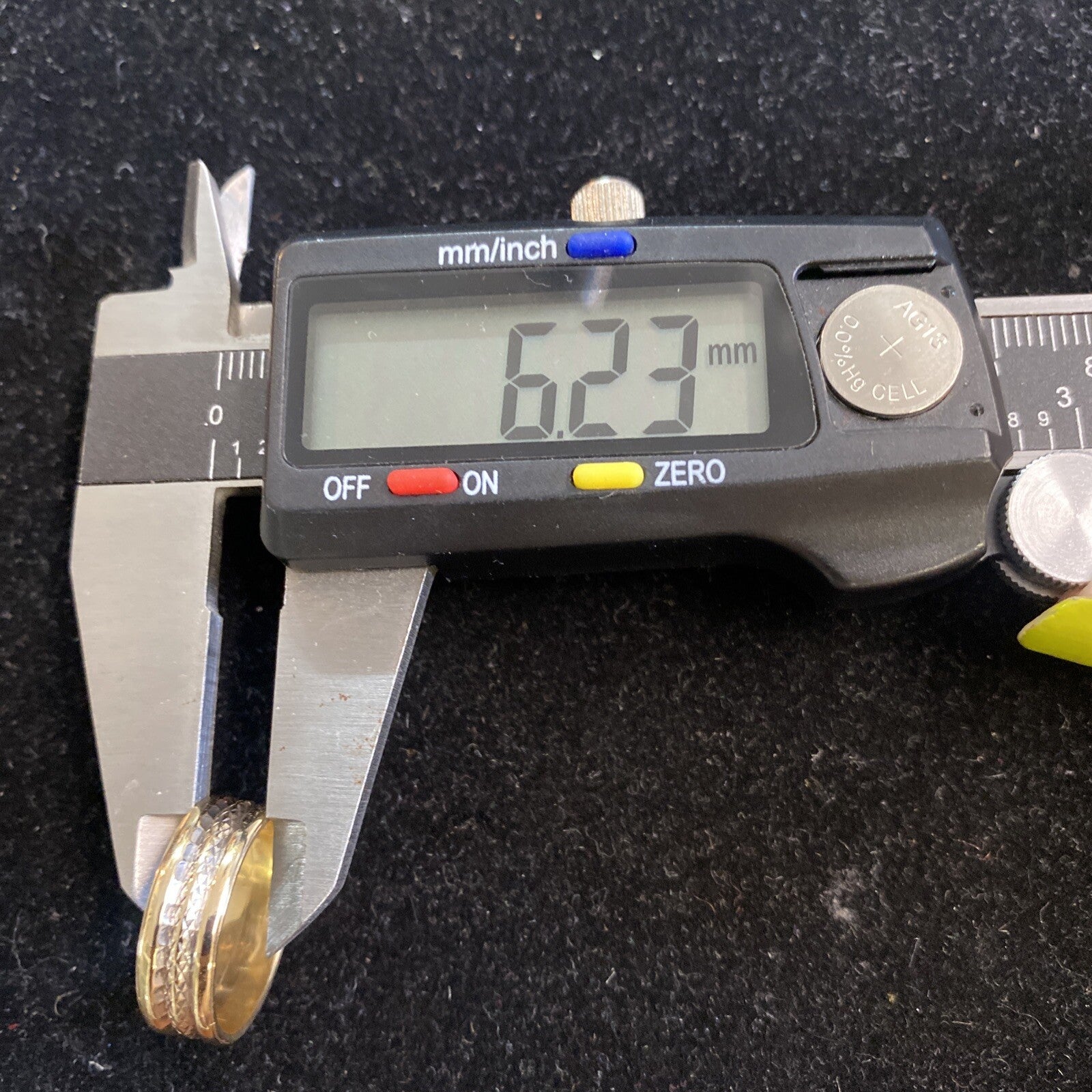 The total weight of both rings is 9.4g, men's weighing 5g, and women's weighing 4.4g. They come in sizes 7.5 and 10 with a band width of 6.23mm in the women's and 6.79mm in the men's.