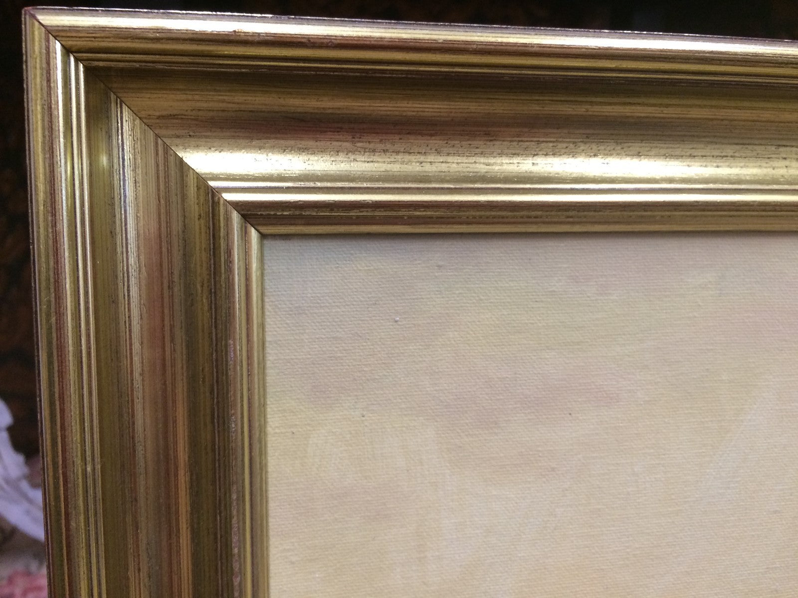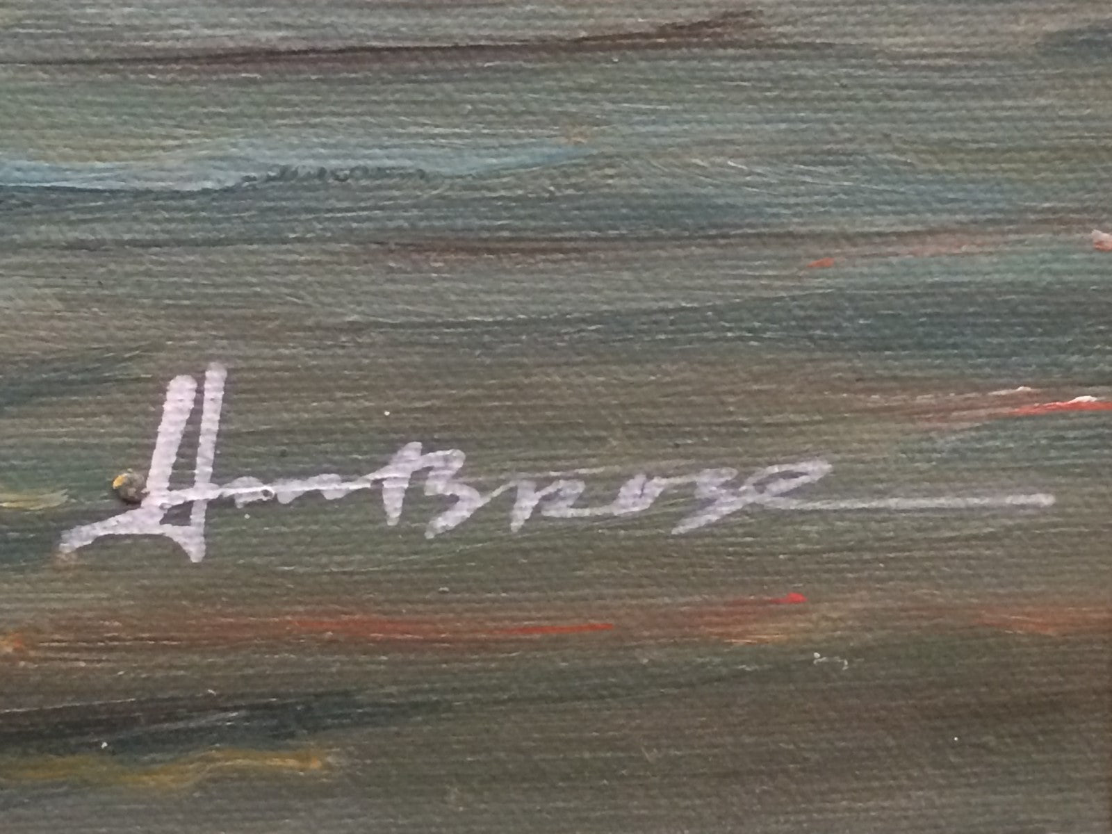 arly 20th century Continental oil on canvas depicting ships in a harbor at sunset, signed illegibly bottom right. The canvas measures 20.5"h x 24"w, overall size including frame 25"h x 27"w x 1"d.