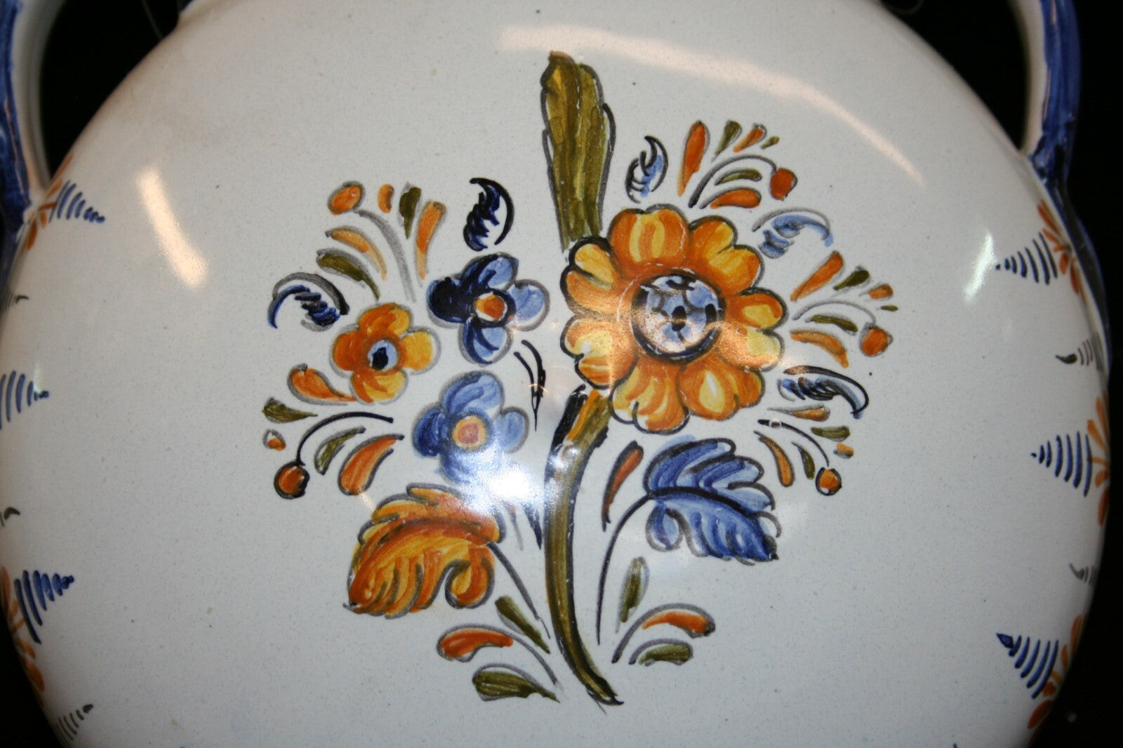 Talavera Spanish Majolica ceramic Water Wine Canteen Decanter with Hand Painted Flowers. It has double handles and a small, round rim.