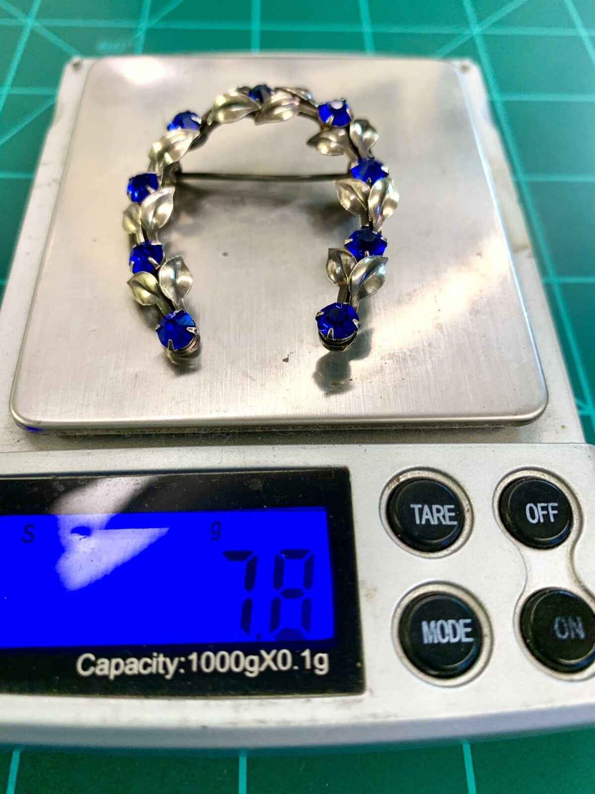 Vtg Sterling Silver Horseshoe Faux Sappphire Stones Leaves Brooch Pin 7.8 gr