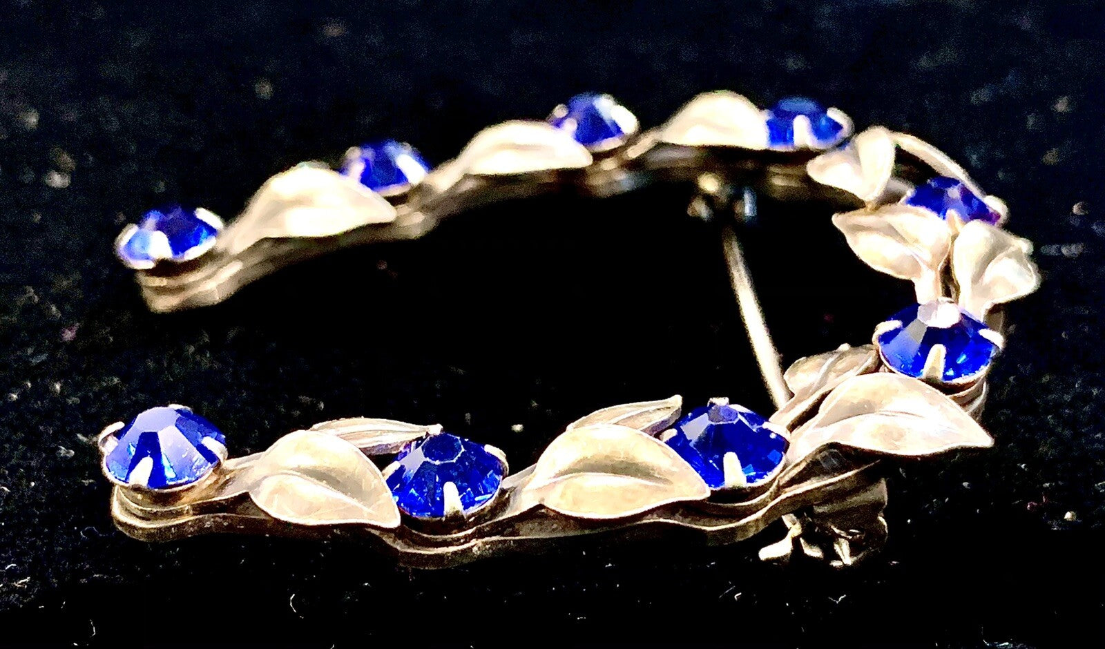 Vintage Sterling Silver Spray Leaves Brooch Pin Blue Stones Horseshoe Shape. H 1 3/4" x W 1 1/2" excellent condition, marked sterling on back. Shipped free with USPS First Class.