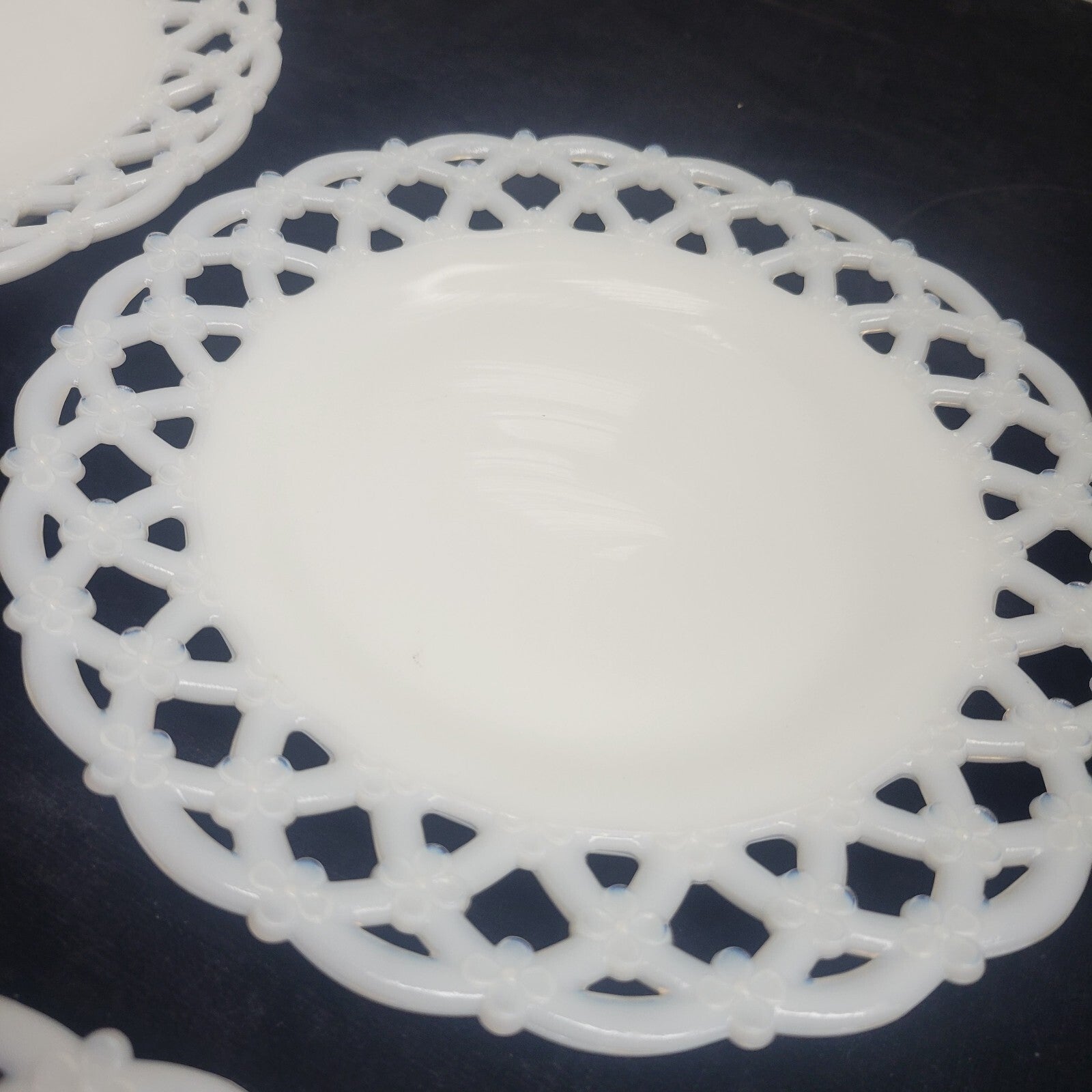 Offered for sale is a set of 3 8.5" milk glass luncheon plates by Westmoreland in the Forget Me Not pattern, Lattice Lace Edge..