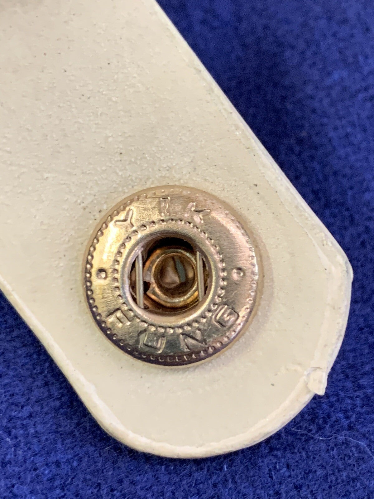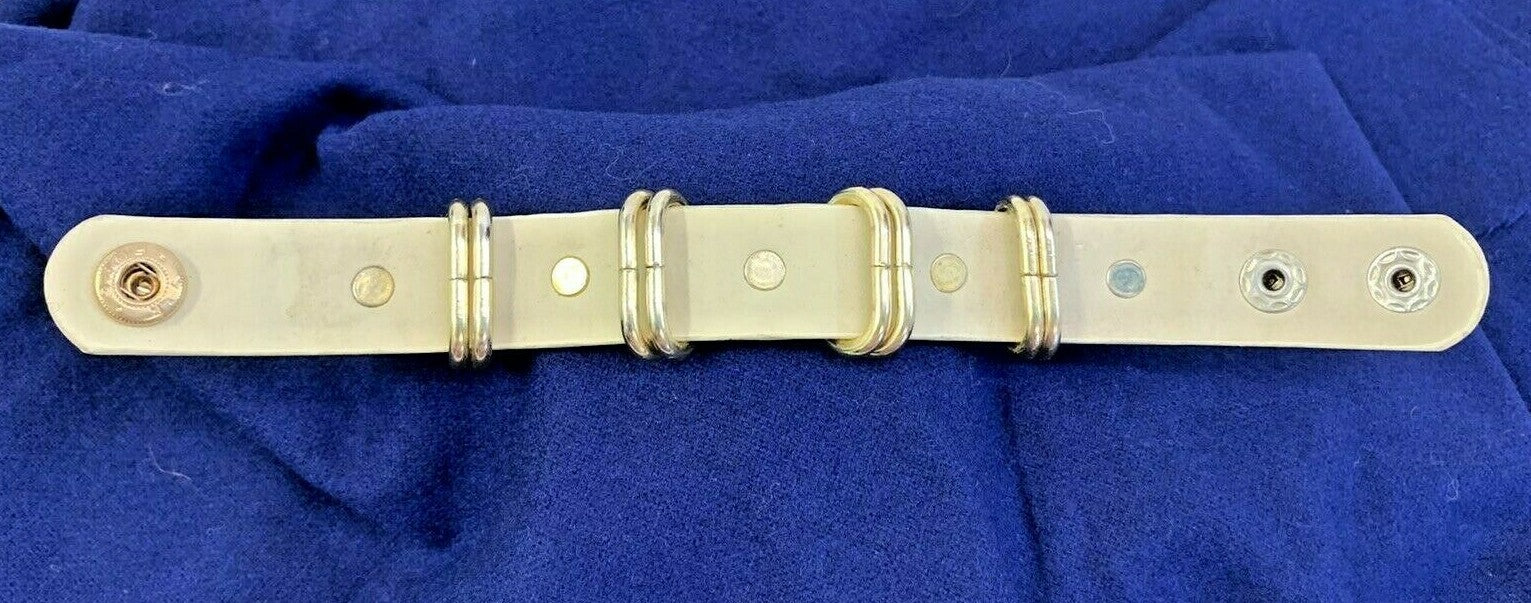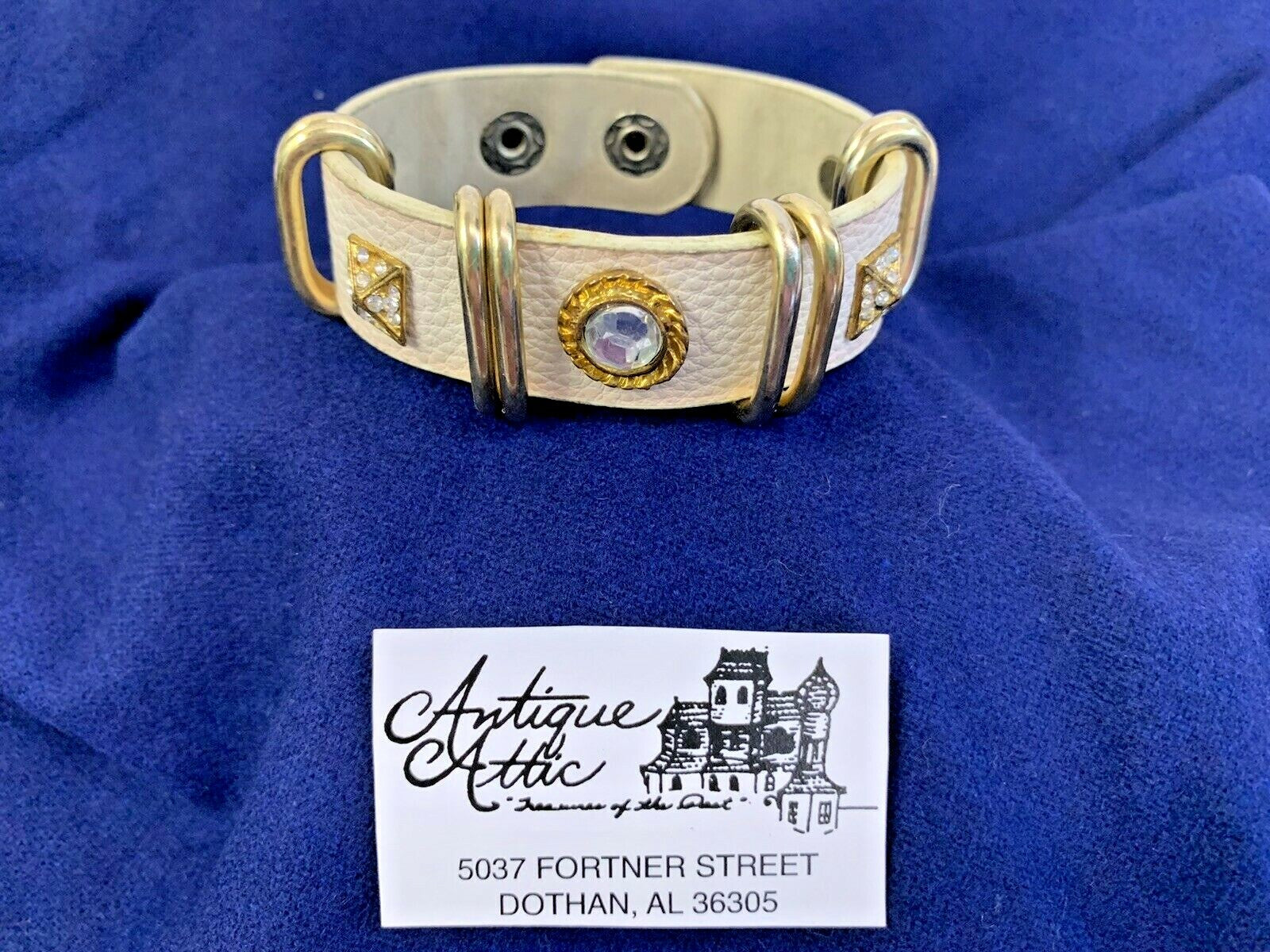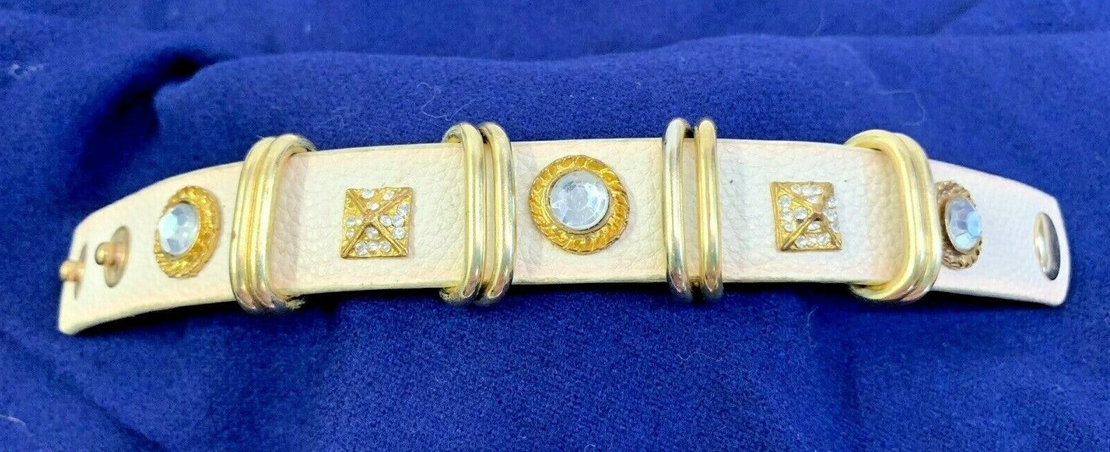 Offered for sale is a vintage signed Yik Fung leather snap bracelet with clear rhinestone studs and wrapped gold tone rings. Excellent condition. 7" wrist or smaller--2 snaps.